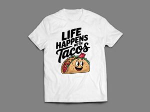 Life is full of tacos, and what better way to celebrate those moments than with my amusing “Life Happens with Tacos” t-shirt? These playful designs are perfect for taco lovers who know that every twist and turn in life is just another reason to enjoy a delicious taco and good company.